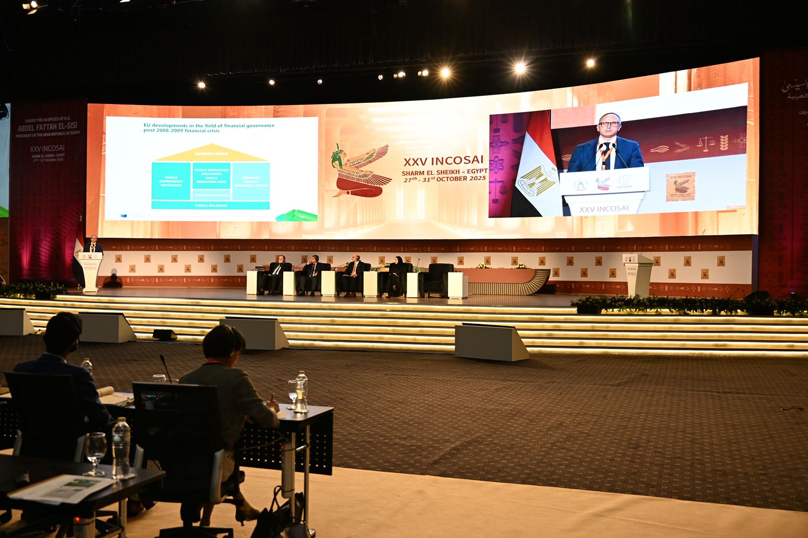 | في إطار فعاليات المؤتمر الخامس والعشرين للمنظمة الدولية للأجهزة العليا للرقابة المالية والمحاسبة "الإنتوساي"، المنعقد بمدينة شرم الشيخ تحت رعاية فخامة الرئيس عبد الفتاح السيسي، عُقدت الجلسة الخاصة بالموضوع الفني الأول بعنوان "دور الأجهزة العليا للرقابة في مراجعة البنوك المركزية والأنشطة الحكومية خلال الأزمات المالية والاقتصادية"، بمشاركة رؤساء الأجهزة العليا للرقابة والخبراء الدوليين وممثلي المنظمات الإقليمية.