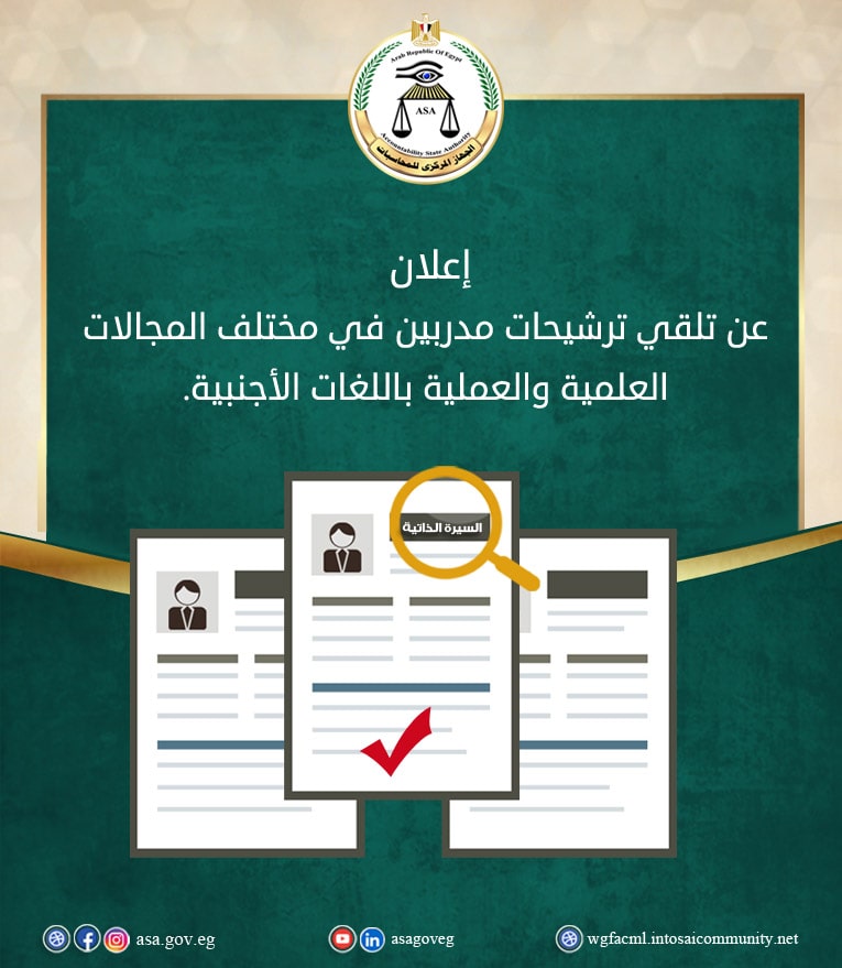 تعلن كلاً من الإدارة المركزية لنظم المعلومات والتحول الرقمي والإدارة المركزية للتدريب والتعليم المستمر عن موافقة معالى المستشار / رئيس الجهاز على قبول تلقى ترشيحات من السادة أعضاء الجهاز كمدربين في كافة المجالات العلمية والعملية باللغة الأجنبية ممن تتوافر فيهم الشروط التالية : -
