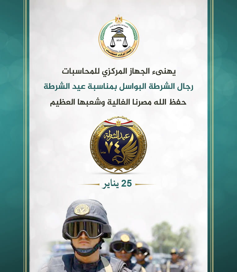 يتقدم المستشار محمد الفيصل يوسف، رئيس الجهاز المركزي للمحاسبات، ونائبه السيد الأستاذ محمد عبد الغني، وجميع قيادات وأعضاء الجهاز والعاملين به، بأسمى آيات التهنئة والتقدير، إلى فخامة السيد الرئيس عبد الفتاح السيسي، رئيس جمهورية مصر العربية، وإلى السيد اللواء محمود توفيق، وزير الداخلية، ورجال ونساء الشرطة البواسل، وشعب مصر العظيم، بمناسبة الذكرى الرابعة والسبعين لعيد الشرطة.